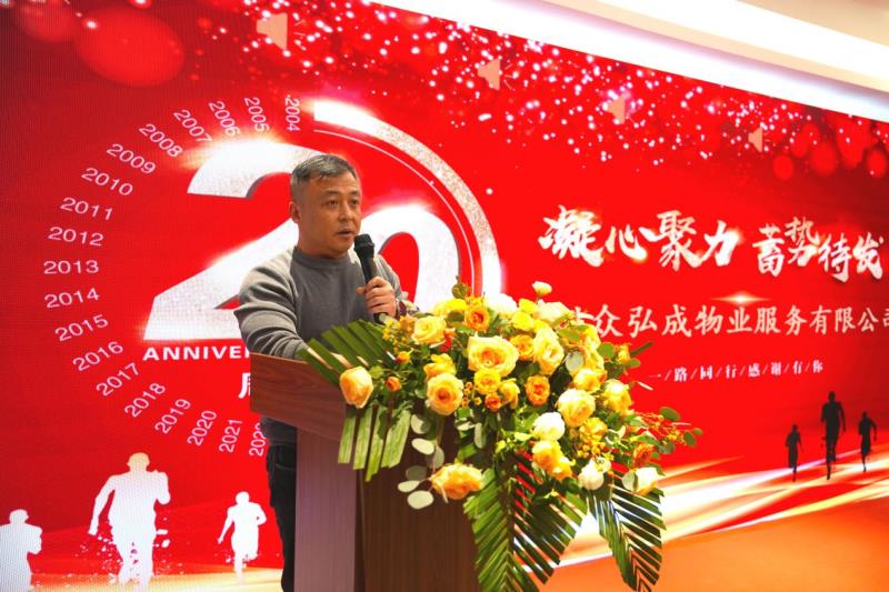 公司董事长郑董发表致辞:首先代表众弘成董事会向公司各个合作单位的大力支持表示衷心感谢,向各位员工的辛勤付出表达谢意;接着就目前物业行业发展现状,深刻分析众弘成物业面临的新挑战和新机遇;我们坚信,在所有员工的共同努力下,在所有合作伙伴的鼎力支持下,众弘成将迈出更加矫健的步伐,走得更加成熟稳健,满怀信心地走向下一个20年。